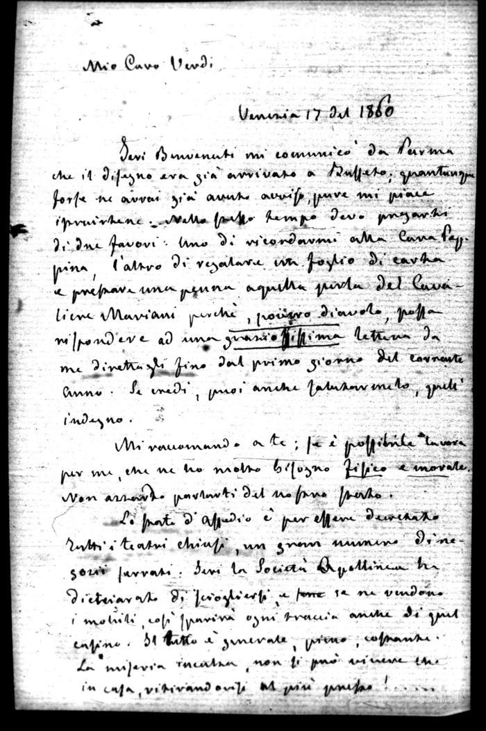 Corrispondenza Francesco Maria Piave a Giuseppe Verdi, 17/01/1860 Venezia, 17 gennaio 1860 read Francesco Maria Piave a Giuseppe Verdi, 17/01/1860