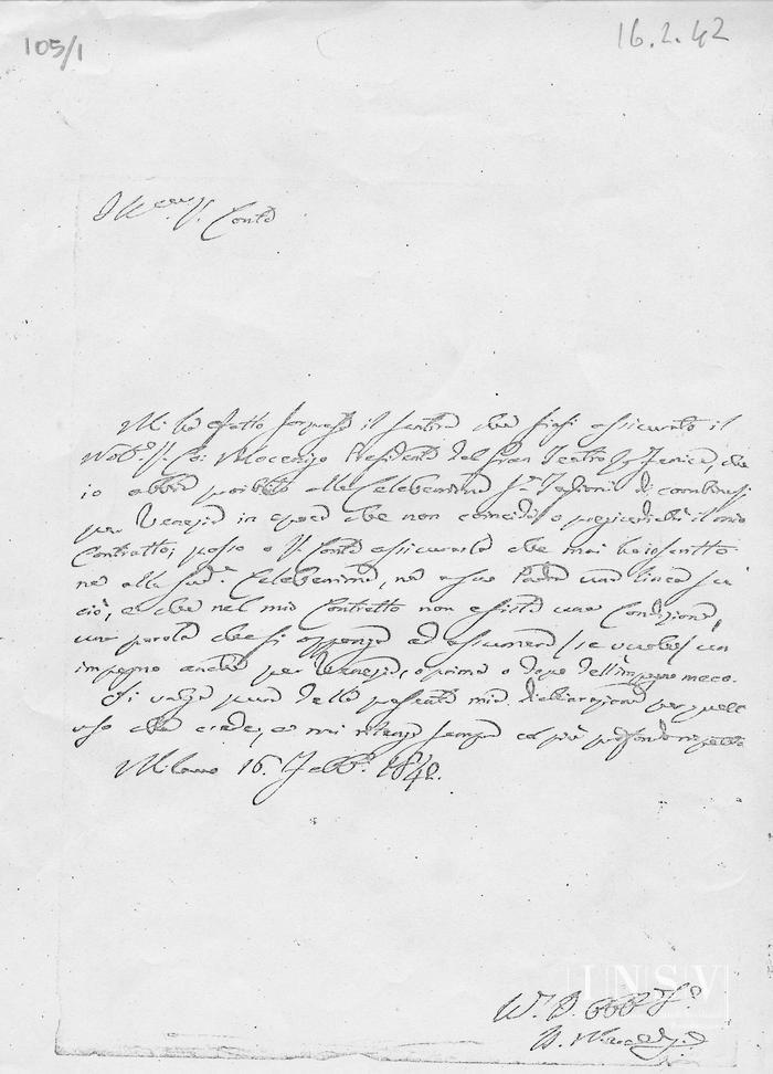 Corrispondenza Bartolomeo Merelli a Alvise Francesco Mocenigo, 16/02/1842 Milano, 16 febbraio 1842 read Bartolomeo Merelli a Alvise Francesco Mocenigo, 16/02/1842