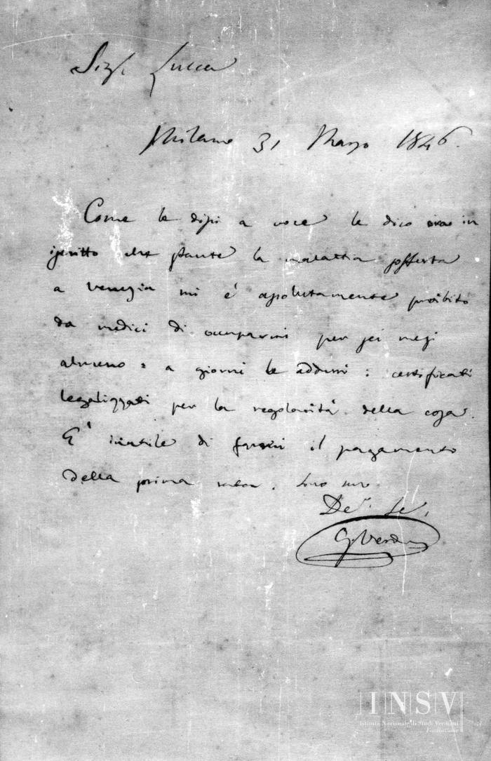 Corrispondenza Giuseppe Verdi a Francesco Lucca, 31/03/1846 Milano, 31 marzo 1846 read Giuseppe Verdi a Francesco Lucca, 31/03/1846