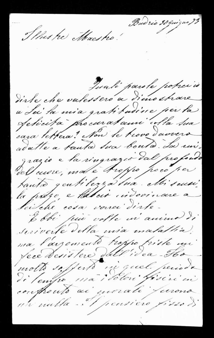 Corrispondenza Giuseppina Pasqua a Giuseppe Verdi, 30/06/1893 Budrio, 30 giugno 1893 read Giuseppina Pasqua a Giuseppe Verdi, 30/06/1893