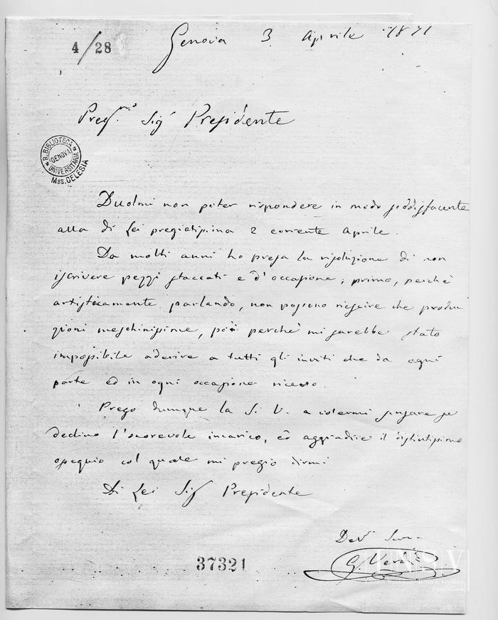 Corrispondenza Giuseppe Verdi a Emanuele Celesia, 03/04/1871 Genova, 3 aprile 1871 read Giuseppe Verdi a Emanuele Celesia, 03/04/1871