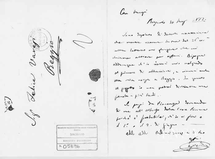 Corrispondenza Giuseppe Verdi a Felice Varesi, 30/05/1852 Busseto, 30 maggio 1852 read Giuseppe Verdi a Felice Varesi, 30/05/1852