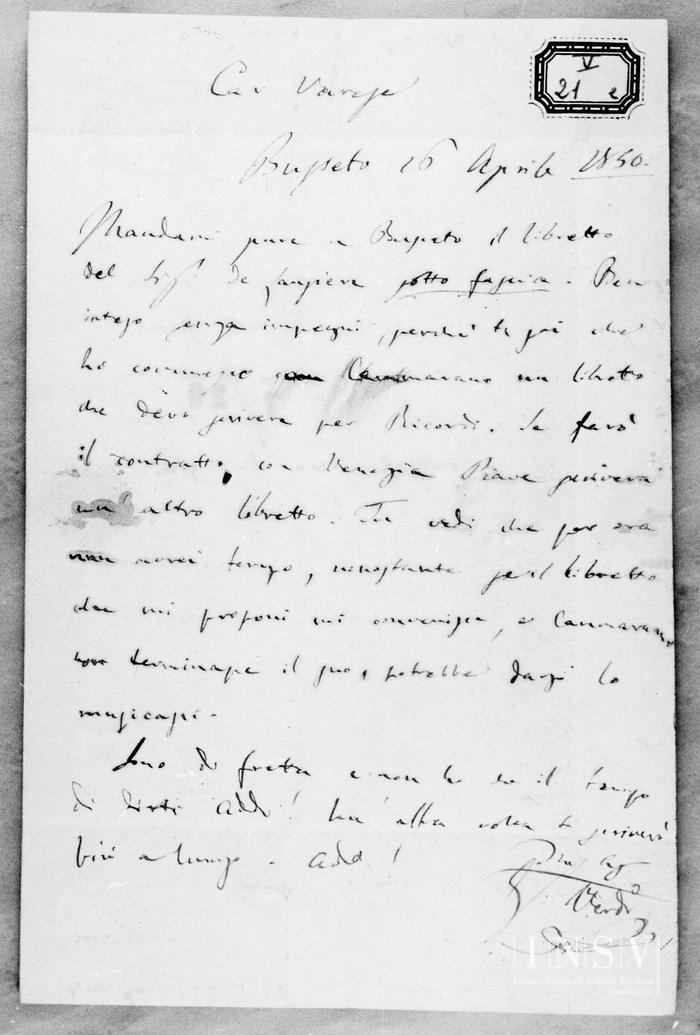 Corrispondenza Giuseppe Verdi a Felice Varesi, 16/04/1850 Busseto, 16 aprile 1850 read Giuseppe Verdi a Felice Varesi, 16/04/1850