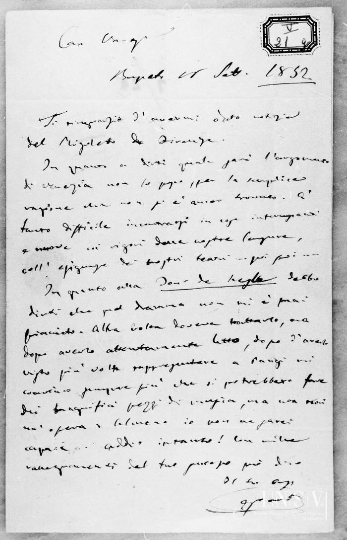 Corrispondenza Giuseppe Verdi a Felice Varesi, 18/09/1852 Busseto, 18 settembre 1852 read Giuseppe Verdi a Felice Varesi, 18/09/1852