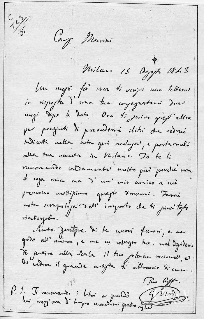 Corrispondenza Giuseppe Verdi a Ignazio Marini, 15/08/1843 Milano, 15 agosto 1843 read Giuseppe Verdi a Ignazio Marini, 15/08/1843