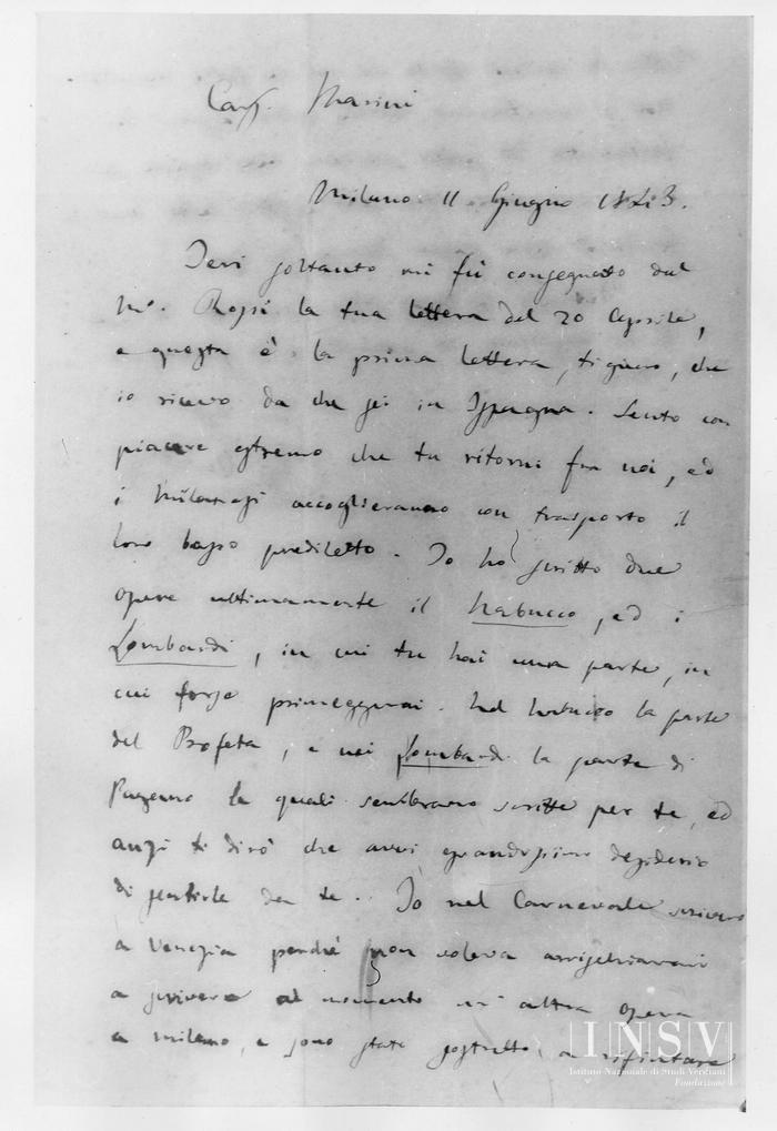Corrispondenza Giuseppe Verdi a Ignazio Marini, 11/06/1843 Milano, 11 giugno 1843 read Giuseppe Verdi a Ignazio Marini, 11/06/1843