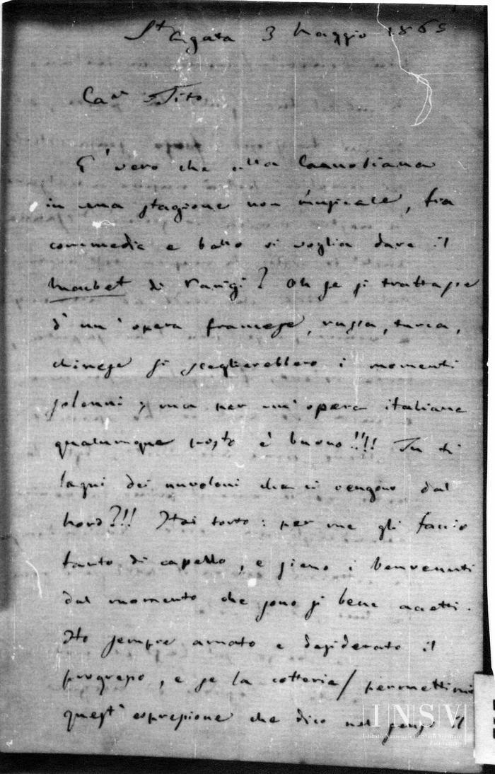Corrispondenza Giuseppe Verdi a Tito I Ricordi, 03/05/1865 Sant'Agata, 3 maggio 1865 read Giuseppe Verdi a Tito I Ricordi, 03/05/1865