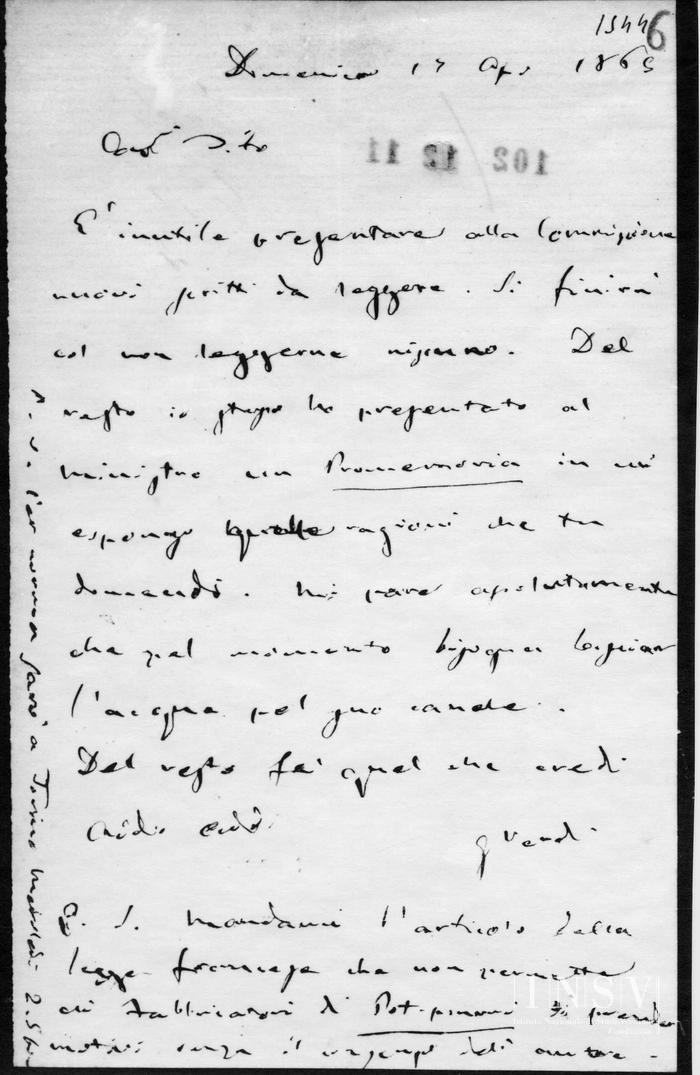 Corrispondenza Giuseppe Verdi a Tito I Ricordi, 17/04/1865 [Sant'Agata], 17 aprile 1865 read Giuseppe Verdi a Tito I Ricordi, 17/04/1865