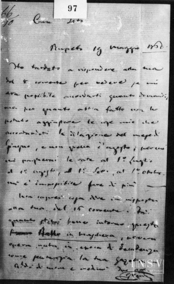 Corrispondenza Giuseppe Verdi a Tito I Ricordi, 19/05/1860 Busseto, 19 maggio 1860 read Giuseppe Verdi a Tito I Ricordi, 19/05/1860