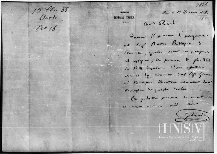 Corrispondenza Giuseppe Verdi a Tito I Ricordi, 13/12/1855 Parigi, 13 dicembre 1855 read Giuseppe Verdi a Tito I Ricordi, 13/12/1855