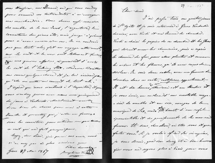 Corrispondenza Giuseppina Strepponi a Léon Escudier, 27/03/1867 Genova, 27 marzo 1867 read Giuseppina Strepponi a Léon Escudier, 27/03/1867