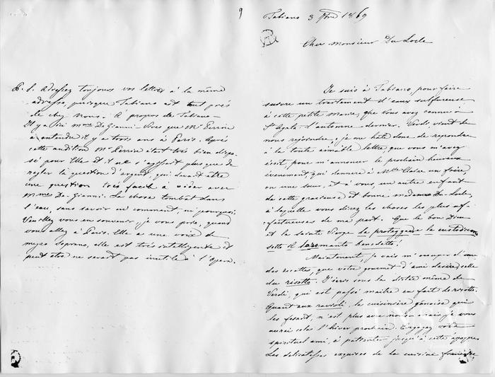 Corrispondenza Giuseppina Strepponi a Camille Du Locle, 03/09/1869 Tabiano, 3 settembre 1869 read Giuseppina Strepponi a Camille Du Locle, 03/09/1869