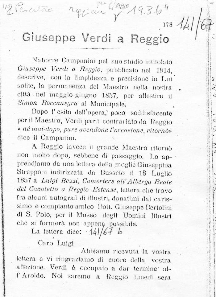Corrispondenza Giuseppina Strepponi a Luigi Bezzi, 18/07/1857 Busseto, 18 luglio 1857 read Giuseppina Strepponi a Luigi Bezzi, 18/07/1857