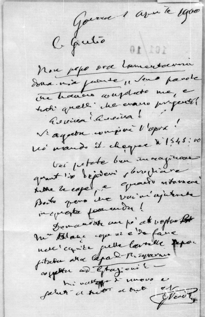 Corrispondenza Giuseppe Verdi a Giulio Ricordi, 01/04/1900 Genova, 1 aprile 1900 read Giuseppe Verdi a Giulio Ricordi, 01/04/1900