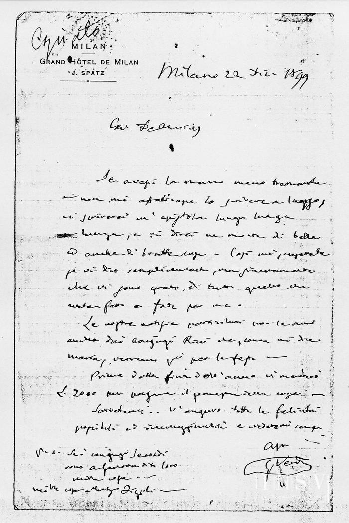 Corrispondenza Giuseppe Verdi a Giuseppe De Amicis, 22/12/1899 Milano, 22 dicembre 1899 read Giuseppe Verdi a Giuseppe De Amicis, 22/12/1899