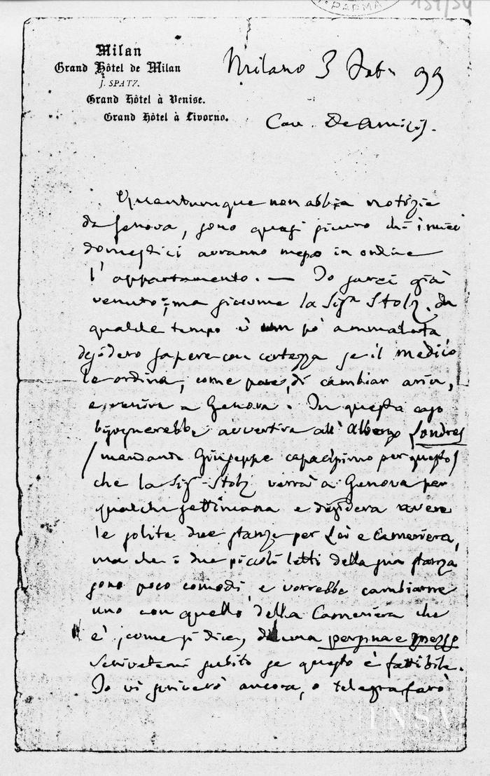 Corrispondenza Giuseppe Verdi a Giuseppe De Amicis, 03/02/1899 Milano, 3 febbraio 1899 read Giuseppe Verdi a Giuseppe De Amicis, 03/02/1899