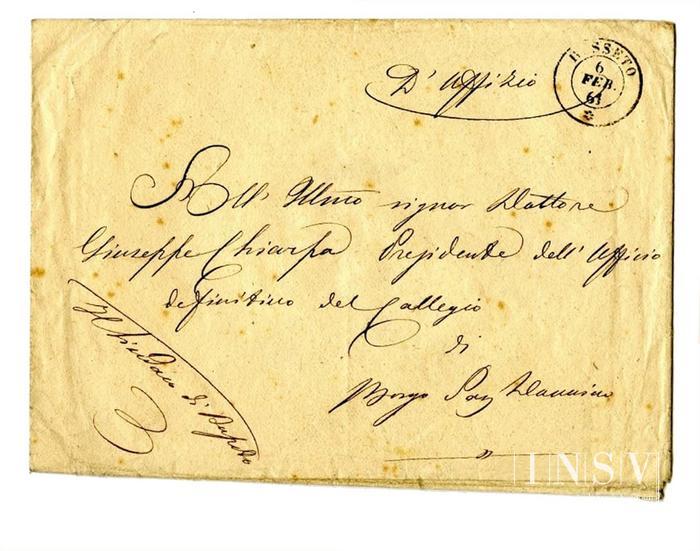 - Un bifolio, due facciate scritte, con busta. Indirizzo non di mano di Verdi. Sul recto della busta, in alto: «D'Uffizio»; in basso: «Il Sindaco di Busseto».