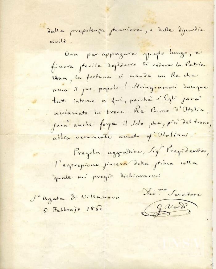 Ora per appagare questo lungo, e finora sterile desiderio di vedere la Patria Una, la fortuna ci mnanda un Re che ama il suo popolo! Stringiamoci dumque tutti intorno a Lui, poiché s'Egli sarà acclamato in breve Re Primo d'Italia, sarà anche forse il Solo, che, più del trono, abbia veramente amato gl'Italiani.