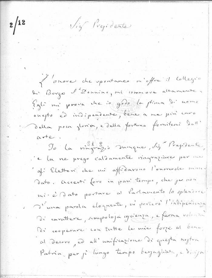 Io la ringrazio dumque, Sigr Presidente, e la ne prego caldamente ringraziare per me gli Elettori che mi affidarono l'onorevole man- dato. Accerti Loro in pari tempo, che se non mi è dato portare al Parlamento lo splendore d'una parola eloquente, vi porterò l'indipendenza di carattere, scrupolosa coscienza, e ferma volontà di cooperare con tutte le mie forze al bene, al decoro, ed all'unificazione di questa nostra Patria per si lungo tempo bersagliata, e divisa dalla prepotenza straniera, e dalle discordie civili.