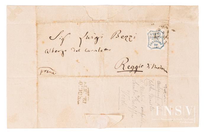 Un bifolio (13,5×21 cm), una facciata scritta. Indirizzo sulla quarta. Accanto all'indirizzo, di mano di Verdi: preme; segni di sigillo in ceralacca; bollo azzurro non dentellato di cent. 20 degli Stati Parmensi (raro); a destra, di mano recente, a matita: «Prezioso / Autografo del / Celebre Maestro / di Musica Compositore / Senatore Giuseppe / Verdi