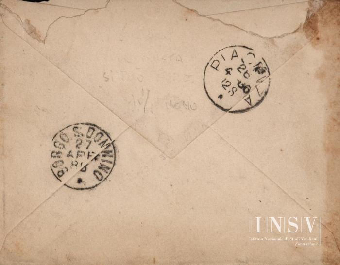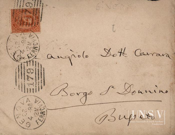 Un bifolio (21×13 cm), una facciata scritta, con busta affrancata (20 cm). Sul recto della busta, a matita, di altra mano, in gran parte eraso a gomma: «G. VERDI / [....]»; analogamente sul altra scrittura sbiadita da cancellatura.