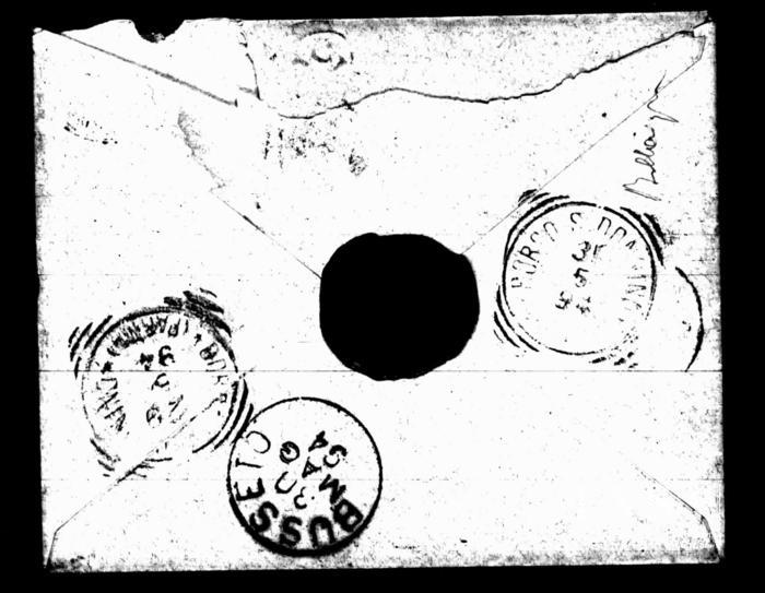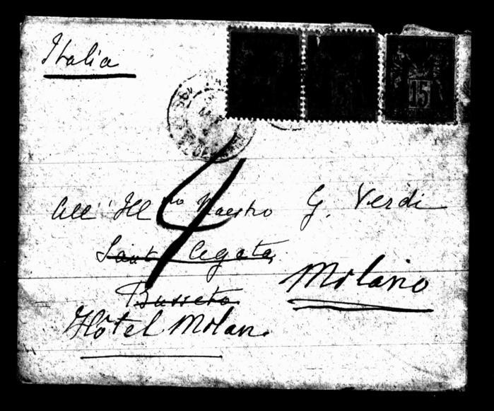 - Un bifolio, quattro facciate scritte, con busta affrancata. La riga finale da «qu'en trois» scritta lungo il margine interno. Prima pagina con intestazione a stampa «28, RUE BARBET DE JOUY». Indirizzo corretto con indicazione all'Hotel Milan di Milano.