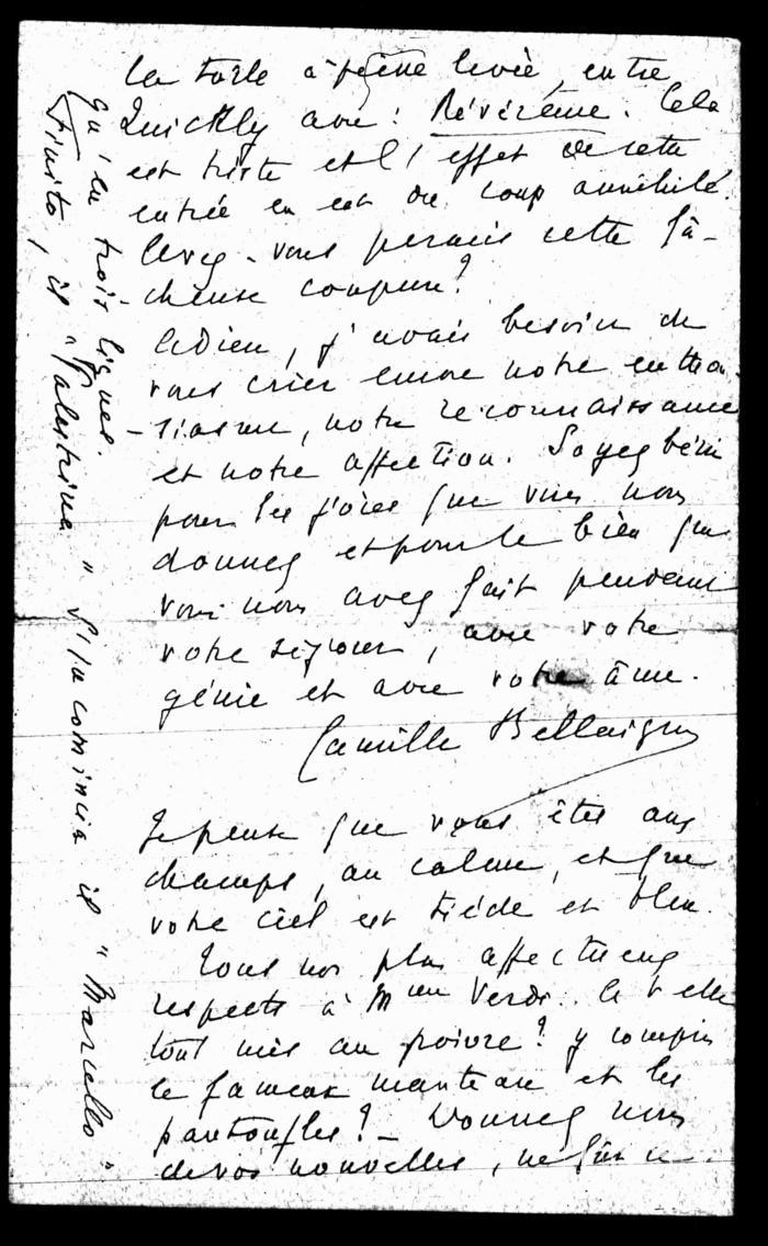 Je pense que vous êtes aux champs, au calme, et que votre ciel est tiède et bleu. Tous nos plus affectueux respects à M.me Verdi. A-t-elle tout mis au poivre? y compris le fameux manteau et les pantoufles? – Donnez-moi de vos nouvelles, ne fût-ce