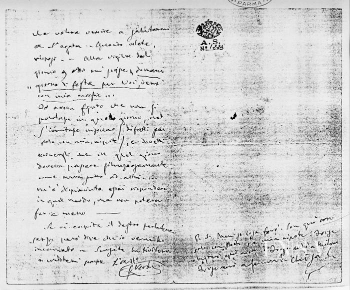 P.S. Non so cosa farò. Son qui solo con Boito e mia nipote. Forse resterò qui molto. Forse andrò a Milano. Forse verrò a Genova! Chissà!