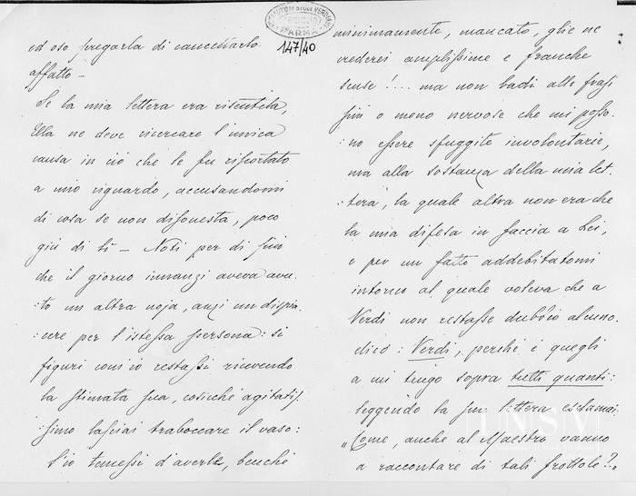 Ricevo la sua stimata d'jeri, e la ricevo con vivissimo dolore, vedendo l'interpretazione ch'Ella ha dato alla mia lettera: può Verdi supporre un solo istante che io possa rispondere con iracondia ad una di lui lettera, od accogliere senza la più alta deferenza una di lui parola di raccomandazione?... Se ciò è, lasci che mi chiami il più disgraziato degli uomini!... No, Maestro, non merito questo giudizio Suo, ed oso pregarla di cancellarlo affatto –