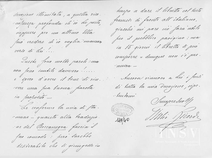 Le confermo la mia di stamane – quanto alla traduzione del Boccanegra faccia il suo comodo: però sarebbe desiderabile che si giungesse in tempo a dare il libretto col testo francese di fronte all'italiano, giacché mi pare ciò sarà utile per il pubblico parigino: ma in 15 giorni il libretto si può comporre = dunque non c'è premura –