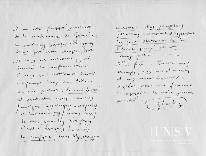 Votre livre est très beau, et en véritable connaisseur, votre critique est élevée, sincère et honnête. J'ai été frappé surtout de la conférence de Genéve. A part les paroles indulgentes dites sur mon compte, dont je vous remercie, j'ai trouvé la confirmation d'idées qui trottinent depuis longtemps dans ma tête. On crie partout: "Le vrai, Le vrai!! et peut-être nous sommes (malgré nos richesses orchestrales et harmoniques) moins dans le vrai que les artistes d'autres époques. Mais la musique, vous dites, changera encore... des soufJles alternés monte ront et descendront les deux plateaux de la balance jusqu'à... et et Ainsi soit-il... —