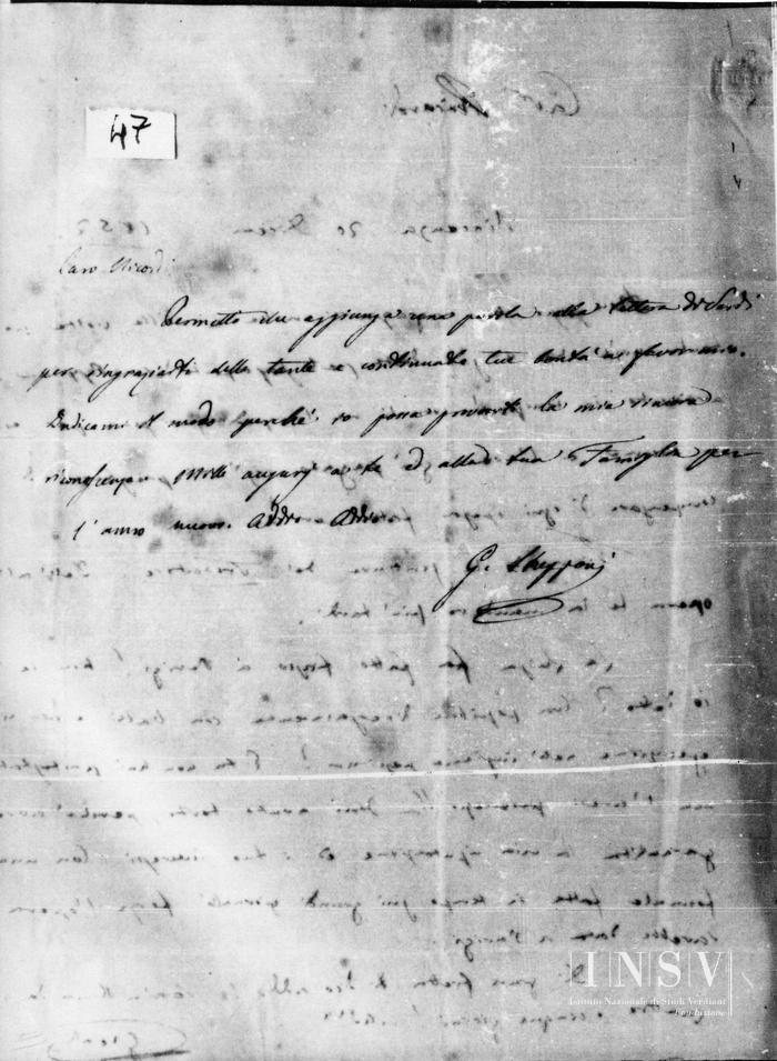 - Un bifolio (25×19,2 cm), una facciata e sei righe scritte. Le ultime tre righe della prima facciata e quelle della seconda di mano di Giuseppina Strepponi. Sulla prima facciata, in alto a sinistra, cancellato: «1171/g»; a destra, di altra mano: «Luisa Miller». Sulla quarta facciata, a matita, di mano recente: «Verdi I-47».
