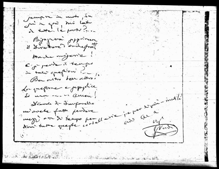 Credo anche che l'orchestra, tal qual è sia ben collocata e distribuita (e non dico questo perché io sia stato il colpevole che così la fissai quando diedi l'Aida ma perché gl'istromenti s'impastano bene, e gli archi accerchiano e chiudono nel mezzo gli istromenti da fiato specialmente gli ottoni. Cosi non sarebbe se metteste tutti i Contrabassi in una fila solo presso il palco scenico: gli ottoni resterebbero troppo scoperti ed avrebbero' dirò così, un riflesso di suono dalle pareti del Teatro Lasciando i Contrabassi dove sono stati finora si eviterebbe l'affare del manico!... Ma dove metterete le Arpe che sono più alte del detto manico?