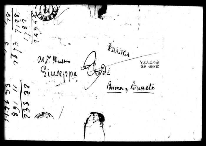 Un bifolio, una facciata scritta, con busta. Sulla quarta, l'indirizzo. Accanto all'indirizzo, alcuni calcoli di mano di Verdi.