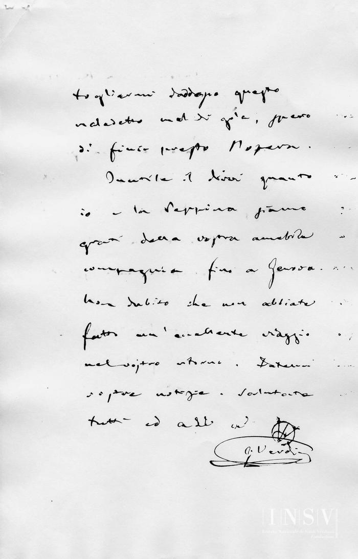 Sono a Piacenza e da qui a poche ore sarò a casa. Il nostro viaggio da Nizza a Genova è stato eccellente ad onta di un mare eccessivamente grosso. Mi sono fermato quasi tre giorni a Genova per bevere un po' di Sole!! Ah queste arie così pure, e questi climi così tiepidi ristorano il sangue ed allargano i polmoni! Appena arrivato a casa, se posso riescire a togliermi daddopo questo maledetto mal di gola, spero di finir presto l'opera.