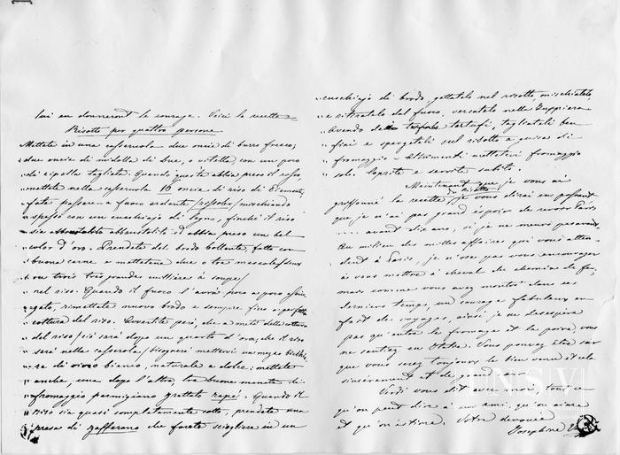 Maintenant, je vais m'occuper d'une des recettes, que votre gourmet d'ami desire, celle du risotto. J'écris sous la dictée même de Verdi, qui est passé maitre en fait de risotto. Quant aux ravioli, la cuisiniere génoise qui les fesait, n'est plus avec nous – mais je vous aurai cela l'ihiver prochain. Engagez votre spirituel ami, à patienter jusqu'à cette epoques. Les delicatesses exquises de la cuisine française lui en donneront le courage. Voici la recette.