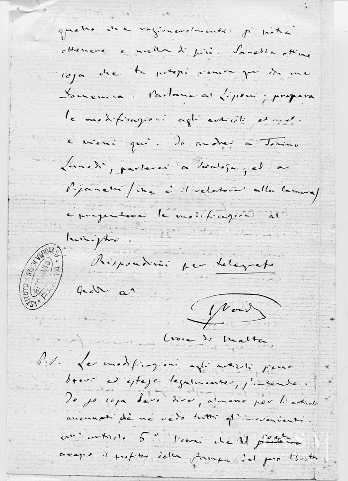 P. S. Le modificazioni agli articoli sieno brevi ed estese legalmente, s’intende. Io so cosa devo dire, almeno per li articoli accennati ché ne vedo tutti gl’in convenienti. All’articolo 6°. vorrei che il Poeta avesse il profitto della stampa del suo libretto: il Maestro quello dello spartito: a metà (quantunque il lavoro del Poeta sia minore) i diritti d’autore sulla rappresentazione qualora il poeta inventi e non faccia una traduzione, come si usa adesso.
