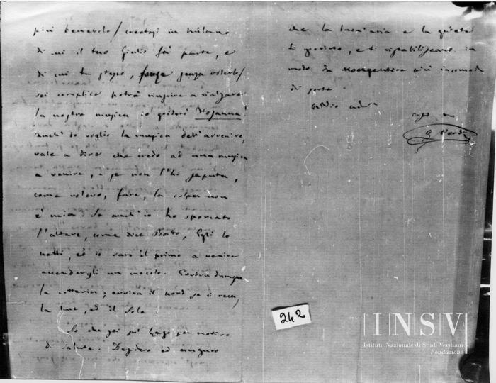 - Un bifolio (21,5×13,3 cm), due facciate e sei righe scritte. Sulla quarta facciata, in alto, di mano della ditta Ricordi: «3 Maggio 65 / Verdi / R 6/5». In basso, a matita, di mano recente: «Verdi II-242».