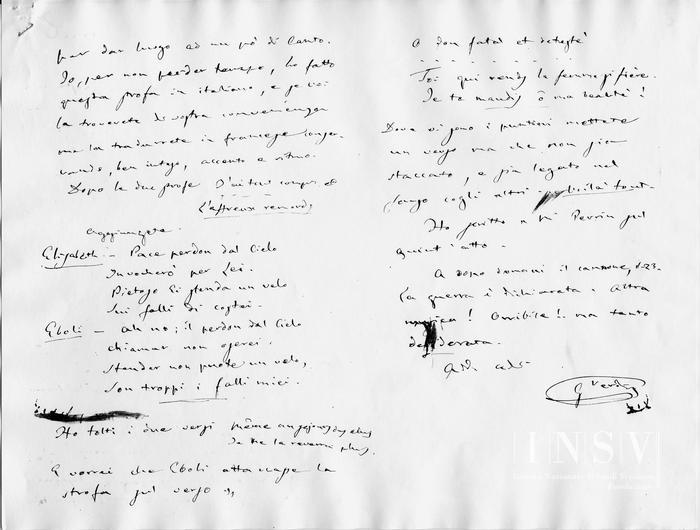 M° Perrin vi consegnerà questa mia e spero che questa vi arriverà. Come vi feci dire da Escudier vi prego di chiedere alla Grande Poste le tue altre mie lettere perché nell'ultima vi pregava d'alcuni cambiamenti. Ora me ne abbisognano ltri nella scena fra Elisabetta ed Eboli.