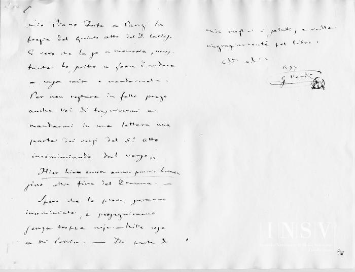 Stupite! Ho dimenticato sul mio Piano Forte a Parigi la poesia del Quinto atto del D. Carlos. E vero che la so a memoria, nonostante ho scritto a Leon di andare a casa mia e mandarmela. Per non restare in fallo, prego anche Voi di trascrivermi e mandarmi in una lettera una parte dei versi del 5° Atto incominciando dal verso "Hier hier encore aucun pouvoir humain sino alla fine del Dramma. —