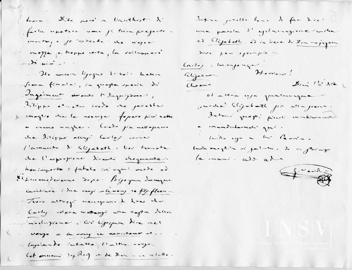 M. Vauthrot m'ha fatto scrivere da Escudier di mandargli l'accomodatura del second'atto nella scena Elisabeth Eboli, e Posa. Non avendo quì lo spartito non saprei come fare l'attacco. È cosa così da poco che sarà fatta al momento appena io sia arrivato a Parigi. Credo peraltro non si guadagnerà gran cosa allungando quella scena, e forse verrà meglio lasciarla come si trova. Dite però a Vauthrot di farla ripetere come si trova presentemente, e se vedete che riesce mozza e troppo corta, la svilupperò di più.