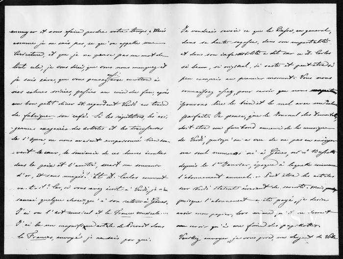 J'ai passé trois, ou quatre jours à St Agata et je suis retournée à Gênes Vendredi dernier, avec Verdi et ma Femme de chambre. Verdi a choisi le papier de la chambre et les Glaces qui doivent orner les cheminées, puis a repris le chemin de fer, pour aller planter et semer les arbres et les fleurs, qu'il aura reçu de Milan. Je suis donc seule, avec ma femme de chambre dans ce vaste, vastissime appartement. Il est dix heures du soir, Mariani est au theatre et je vous écris au milieu d'un véritabile magasin de meubles et au son, non pas de la musique de Sax, mais au bruit d'une rafale épouvantable et des gémissements de la mer en fureur. Et Vous, cher Léon, où êtes vous et que faites vous? Si je voulais faire des simagrées, je vous dirais, que vous devez être bien heureux que nous ne soyons plus à Paris, pour vous ennuyer et vous faire perdre votre temps, mais comme je ne suis pas, ce qu'on appelle une Caricature, et que je ne pense pas un mot de tout cela, je vous dirai, que vous nous manquez et je suis sûre, que vous pensez aussi avec emotion a nos calmes soirées, passées au coin du feu, après un bon petit diner en regardant Verdi en train de fabriquer son café. Si les répétitions, les exigences exagerées des Artistes et les tracasseries de l'Opera, ne nous avaient empoisonné bien souvent le coeur, le souvenir de ces heures écoulées dans la paix et l'amitié, serait un souvenir d'or, et sans nuages! Et D. Carlos comment va-t-il? Car, si vous avez écrit à Verdi, je n'en saurai quelque chose, qu'à son retour à Gênes. J'ai vu l'Art musical et la France musicale... J'ai lu un magnifique article de Prevost dans la Francem envoyé je ne sais par qui. Je voudrai savoir ce que la Press, en general, dans sa haute sagesse, dans son impartialité et dans son infaillibilité a dit sur ce D. Carlos si beau, si original, si vaste et peut être si peu compris au premier moment. Vous nous connnaisez assez, pour savoir qui nous pouvons lire le bien et le mal avec une calme parfaite. Je pense, qui le Journal des Damoiselles, doit être un furibond ennemi de la musique de Verdi, puisqu'on a cru de ne pas en envoyer un seul numero ni à Gênes, ni à Bussetto, depuis le 1er Janvier, époque à laquelle commence l'abonnement annuel... Peut être les articles sur Verdi étaient écrasant de séverité. Mais puisque l'abonnement a été payé, je desire avoir mon papier, lors même qu'il ou devrait servir qu'à me faire des papillotes. Veuillez envoyer, je vous prie, un Sergent de Ville, un Huissier, un Zorare, ou qui vous voudrez pour sommer ces Antiverdistes à en envoyer ma marchandise. Nous devons aussi recevoir des meubles de la rue Jacob; l'argenterie, la couverture du piano etc., mais jusqu'à présent, nous n'avons encore rien vu. Je ne voudrais pas qui tout cela, fuit un voyage cette nuit, car le vent et la mer sont tellement furieux, que mes pauvres affaires, risqueraient d'avoir le sort de l'Evening Star. Madame Baratte en saura quelque chose et je lui écrirai pour qu'elle me mette au courent de tout cela.