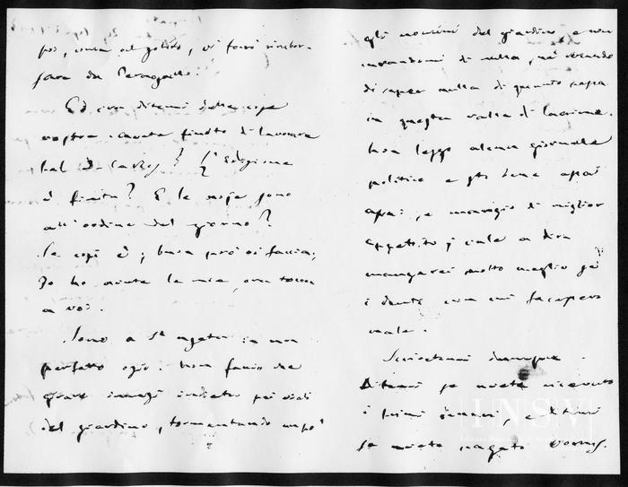 Sono a St Agata: a non perfetto agio. Non faccio che girare innanzi indietro pei viali del giardino, tormentando un po' gli uomini del giardino, e non curandomi di nulla, né cercando di saper nulla di quanto passa in questa valle di lacrime. Non leggo alcun giornale politico e sto bene assai assai, e mangio di miglior appetito; vale a dire mangerei molto meglio se i denti non mi facessero male.