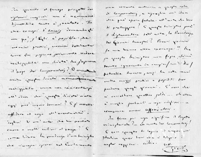 In quanto al famoso progetto di ristauri musicali, non è nemmeno discutibile tanto è sventato. Tu che conosci il d’Arcais, domandagli un po’ s’Egli è possibile che uomini pratici, uomini dell’arte come Lui, possano seriamente credere realizzabile una società che s’assuma il peso dei Conservatorj? Ed ammettendo anche questa società momentaneamente realizzabile, come non spaventarsi all’idea che questa società nata oggi può morire domani? E si vorrebbe affidare al caso all’eventualità: destini di un’arte che ha portato cuore e molti milioni al paese? E come lodare la prudenza d’un Ministro che riconosce esservi nel Parlamento una corrente contraria a questa roba di Conservatorj, e risveglia un’idea che può essere fatale all’arte che dice di proteggere? E questo Ministro sarà il Ristauratore dell’arte, la Provvidenza dei Giovani Maestri? Poveri giovani se non hanno altre speranze!! Ma se questo Ministro non fosse, ahimé tanto ignorante in musica (così Ei dice) potrebbe trovare, anzi ha nelle mani mille mezzi pratici e possibili per produrre questi giovani. È vero che ci vorrebbero quattro soldi... oh allora è meglio serbarli a cose migliori... e comprare nuovi affondatori.