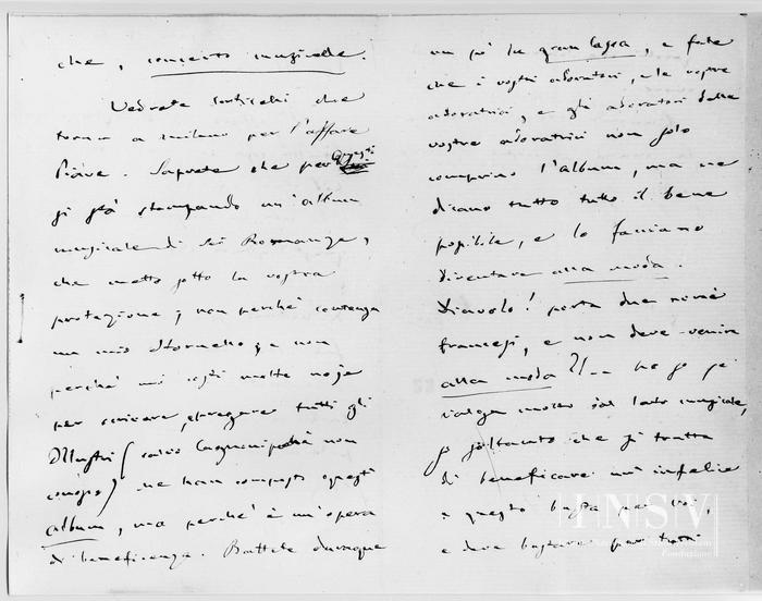 Vedrete Corticelli che torna a Milano per l'affare Piave. Saprete che per questi si stà stampando un album musicale di sei Romanze, che metto sotto la vostra protezione; non perché contenga un mio Stornello: e non perché mi costi molte noje per cercare, e pregare tutti gli Illustri (salvo Cagnoni perché non conosco) che han composto quest'Album, ma perché è un'opera di beneficenza. Battete dunque un po' la gran Cassa, e fate che i vostri adoratori, e le vostre adoratrici, e gli adoratori delle vostre adoratrici non solo comprino l'Album, ma ne dicano tutto tutto il bene possibile, e lo facciano diventare alla moda.