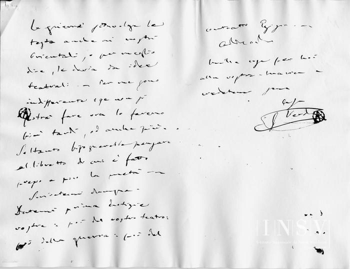 Non ho più sentito nulla del nostro contratto. Forse la guerra sconvolge la testa anche ai vostri Orientali, o per meglio dire, le devia da idee teatrali. – Per me sono indifferente: se non si potrà fare ora lo faremo più tardi, od anche più. Soltanto bisognerebbe pensare al libretto di cui è fatta presso a poco la metà - - -