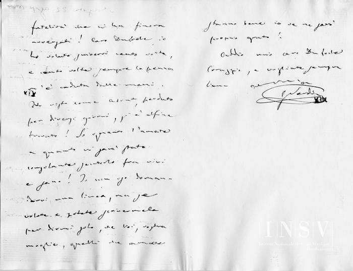 Aveva aperto l'animo nella speranza jer, oggi sono annientato! Vi è finora qualche cosa di fatale in questa opera impresa, bisogna pur dirlo, con grande spensieratezza. Pare il valore francese finirà per vincere il destino e la fatalità che ci ha finora avversati! Caro Du Locle: ho voluto scrivervi cento volte, e cento volte la penna è caduta dalle mani. Ho visto come Albert, perduto per diversi giorni, si è alfine trovato! So quanto l'amate e quanto vi sarà stato consolante sentirlo fra vivi e sano! Io non oso domandarvi una linea, ma se volete e potete scrivermela per dirmi solo, che Voi, vostra moglie, quelli che amate stanno bene io ve ne sarò proprio grato!