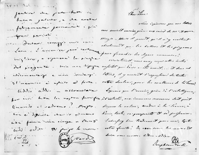 - Un bifolio, tre facciate scritte, con busta affrancata (40 cent.). Sulla prima facciata, in alto a sinistra, di altra mano, a matita, entro circoletto: «161.». Timbro dell'Archive de l'Opéra.