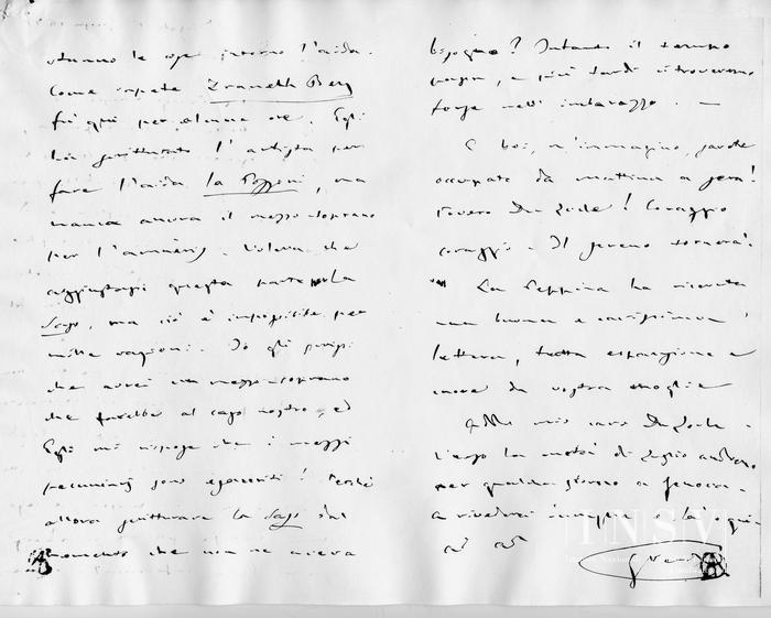 So che Parigi rinasce e ritorna brillante come prima, ed io desidero che prosperi, e trovi un Governo durabile per la pace vostra, nostra, e di tutti... Ma di che m'immischio io? – A quest'ora avrete ricevuto la mia in risposta del 1° Giugno in cui vi dicevo che contavo proprio di vedervi non a Parigi, ma quì dal momento che Voi venite a Aix - - Credo altresì d'avervi detto che Mariette Bey viene in Europa, e caso mai venisse prima a Parigi sarà bene informarlo come stanno le cose intorno l'Aida. Come sapete Draneth Bey fù quì per alcune ore. Egli ha scritturato l'artista per fare l'Aida la Pozzoni, ma manca ancora il mezzo-soprano per l'Amnèris. Voleva che aggiustassi questa parte per la Sass, ma ciò è impossibile per mille ragioni. Io gli scrissi che avrei un mezzo-soprano che farebbe al caso nostro, ed Egli mi rispose che i mezzi pecuniarj sono esauriti! Perché allora scritturare la Sass dal momento che non ne aveva bisogno? Intanto il tempo passa, e più tardi ci troveremo forse nell'imbarazzo. –