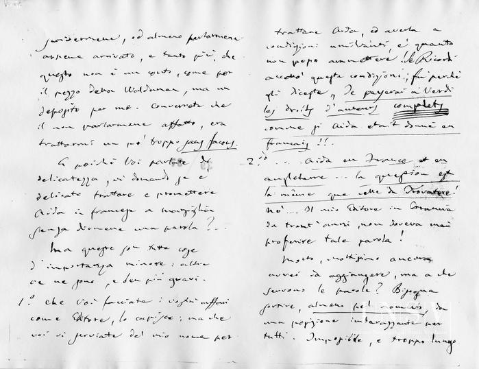 1° Che Voi facciate i vostri affari come Editore, lo capisco: ma che Voi vi serviate del mio nome per trattare Aida, ed averla a condizioni umilianti, è quanto non posso ammettere! Se Ricordi accettò queste condizioni, fù perché gli diceste "Je payerai à Verdi les droits d'auteurs complets comme si Aida etait donné en fracais!!
